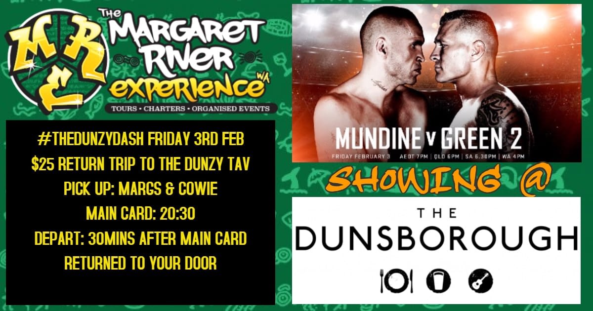 #thedunzydash ‘Green vs Mundine’ ‘FRI 3RD FEB’ ‘Margs, Cowie to The Dunzy Tav’
