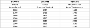 COWIE CREW: Please see smaller timetable for return times from town